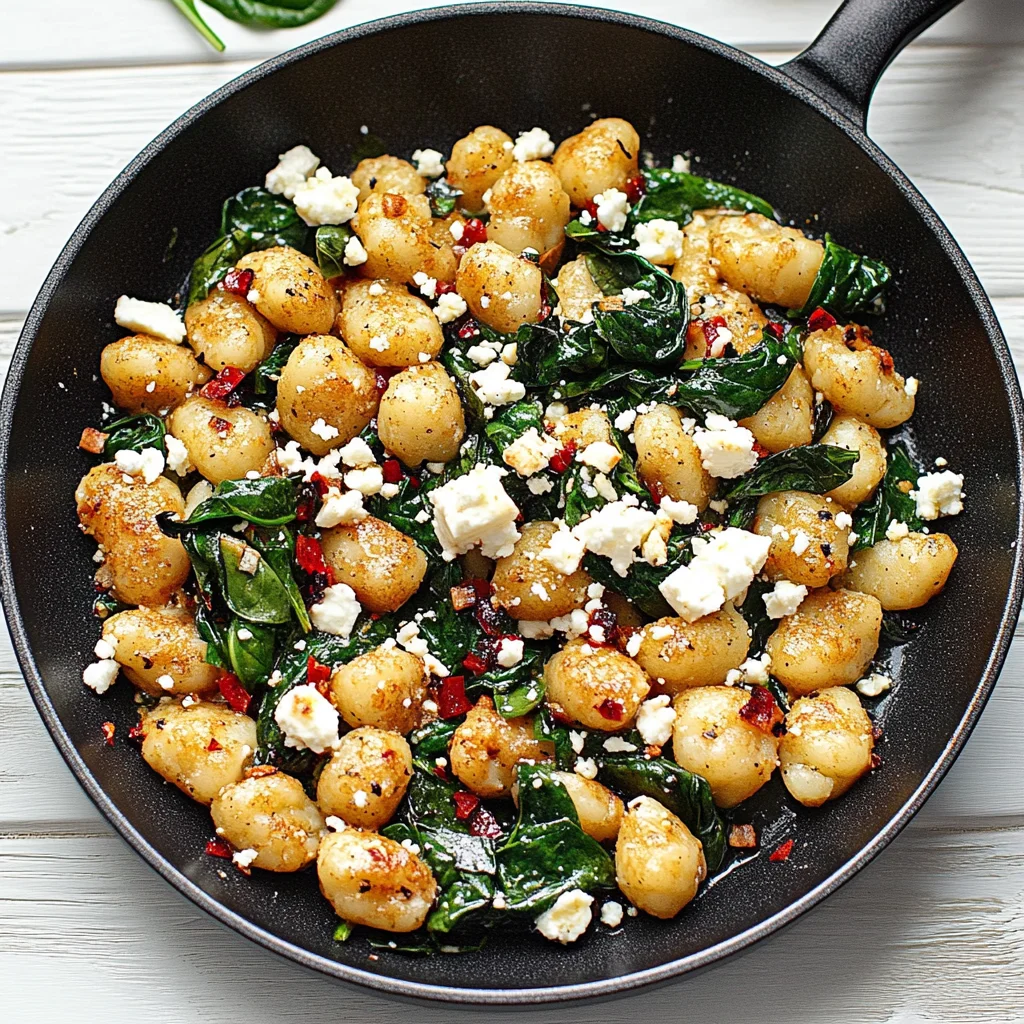 Crispy Gnocchi With Spinach And Feta is a flavorful dish that beautifully combines the tenderness of gnocchi with the vibrant freshness of sautéed spinach and the tangy richness of crumbled feta cheese. This delightful meal features gnocchi that are pan-fried to achieve a crispy exterior while maintaining a soft and pillowy inside, creating a satisfying texture contrast. Enhanced by the aromatic notes of minced garlic and seasoned with olive oil, salt, and pepper, this one-pan dish is not only quick to prepare but also makes for easy cleanup, making it perfect for a busy weeknight dinner.