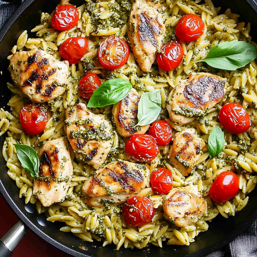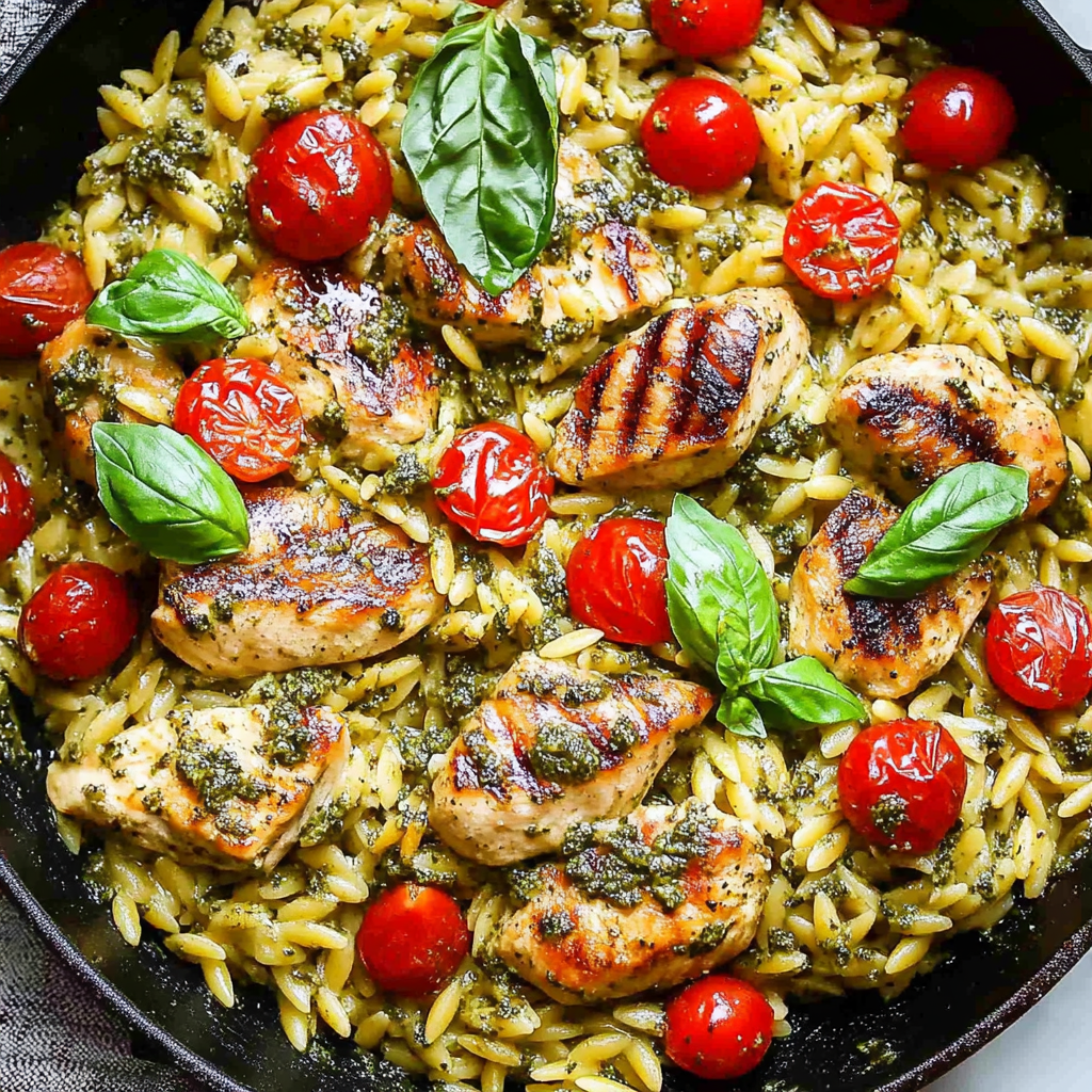 One Pan Chicken & Pesto Orzo is a quick and flavorful dish combining tender chicken pieces, creamy orzo pasta, vibrant pesto, and juicy cherry tomatoes—all cooked in one pan for easy cleanup!